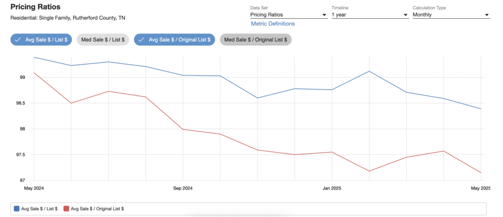 And this is the part that drives the previous point home. The blue line shows average sales price compared to the list price when the house went under contract. You can see it has been trending downward from very close to 100% to now around 98.4% (in one year!!). But look at the red line. That is average sales price compared to ORIGINAL list price. A year ago it was above 99% and has since dropped quickly to almost 97%. This line captures the effects of price reductions AND negotiated price drops in a contract. It also captures situations where an agent just plain prices it wrong. Put numbers to it–if a house is listed for $600,000 and has a 3% price drop, it is now $582,000. That is the AVERAGE. Compare that to the median (sorry, failed to get on this graph) at 99.4% and you see that half of all sales get better than 99% on their original list price. Outliers on the high side drag this down to almost 97%. That’s HUGE! It is also important to note that our sample size is much smaller than 5 years ago. We went from 718 closings in June of 2020 vs. 454 in May of this year. This drop in activity gives much more weight to each outlier.